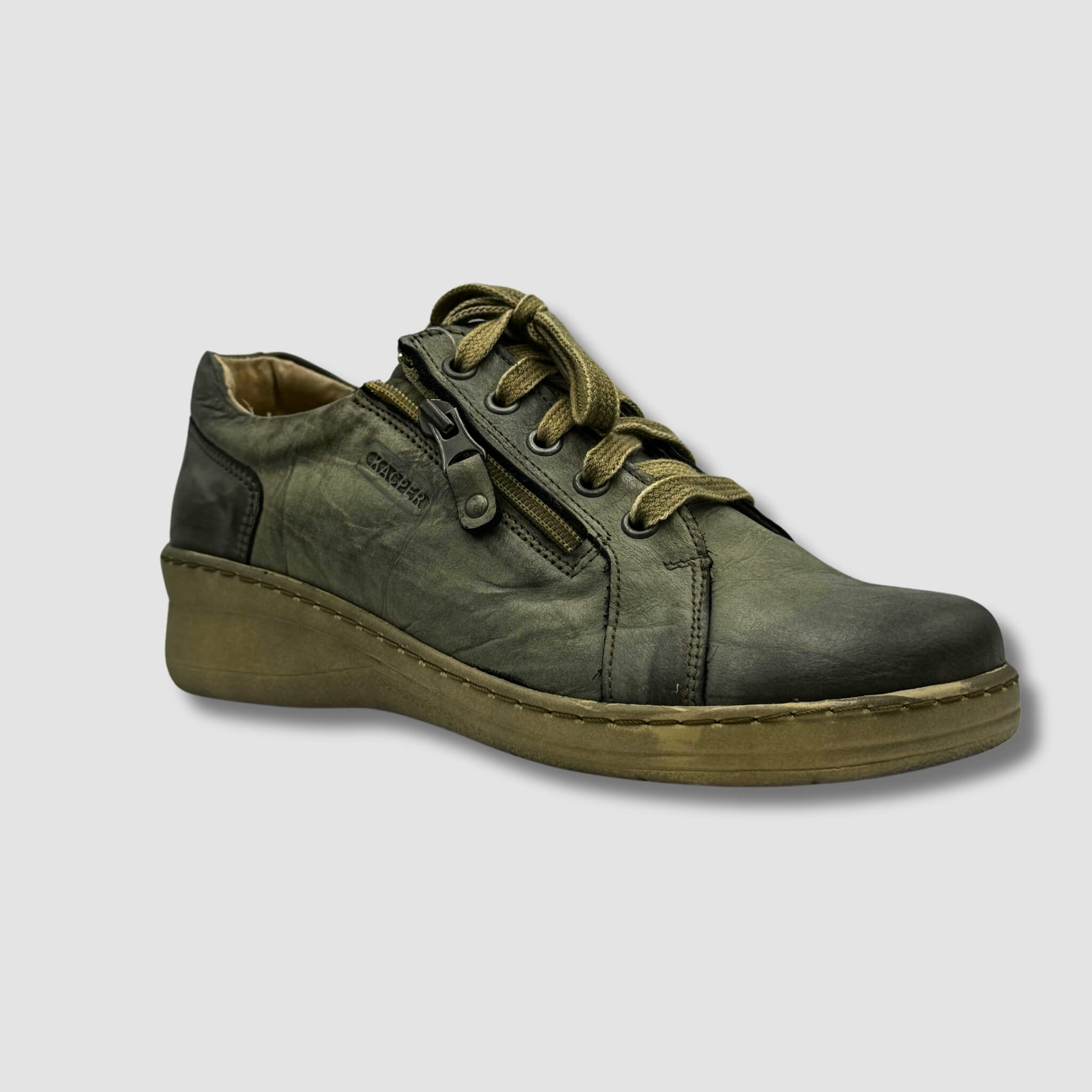 Zamek błyskawiczny umieszczony z boku buta ułatwia szybkie zakładanie, a sznurowanie zapewnia perfekcyjne dopasowanie do stopy. Podwyższona, dobrze wyprofilowana podeszwa oferuje wsparcie i komfort przez cały dzień, a solidne przeszycia podkreślają rzemieślniczą precyzję wykonania.