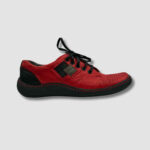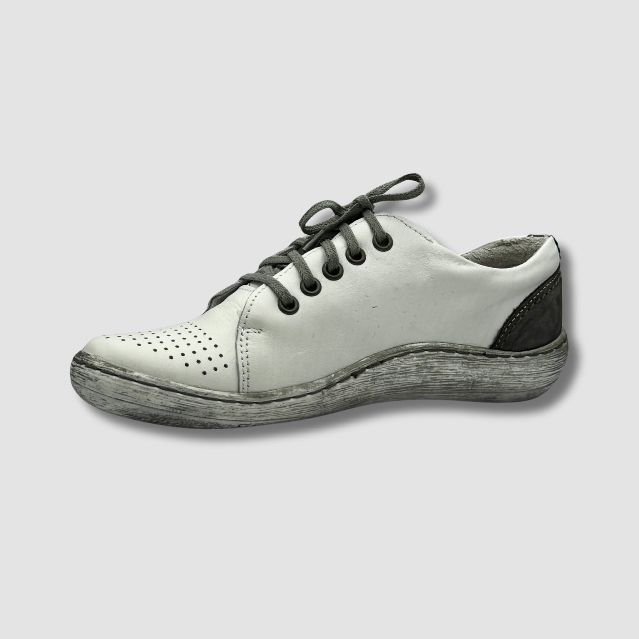 Sznurowanie pozwala na idealne dopasowanie, a ozdobne przeszycia i subtelne detale, takie jak kontrastowe wstawki, nadają butowi nowoczesny wygląd. Lekka, wytrzymała podeszwa zapewnia stabilność i komfort przez cały dzień, a delikatne przetarcia dodają mu unikalnego charakteru.