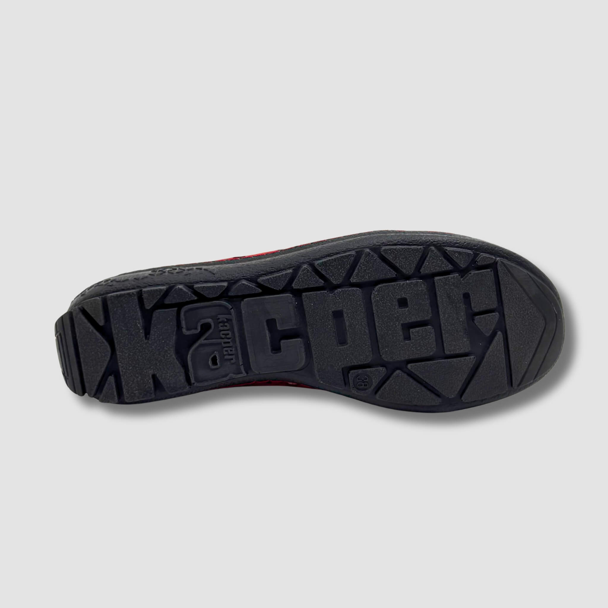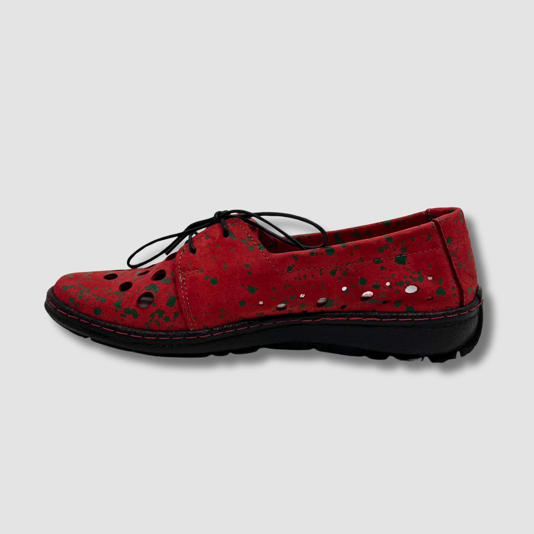 Wyjątkowe półbuty damskie ze skóry naturalnej w intensywnym czerwonym kolorze z artystycznym efektem zielonych i czarnych „plamek” to propozycja dla kobiet, które lubią modę z charakterem.