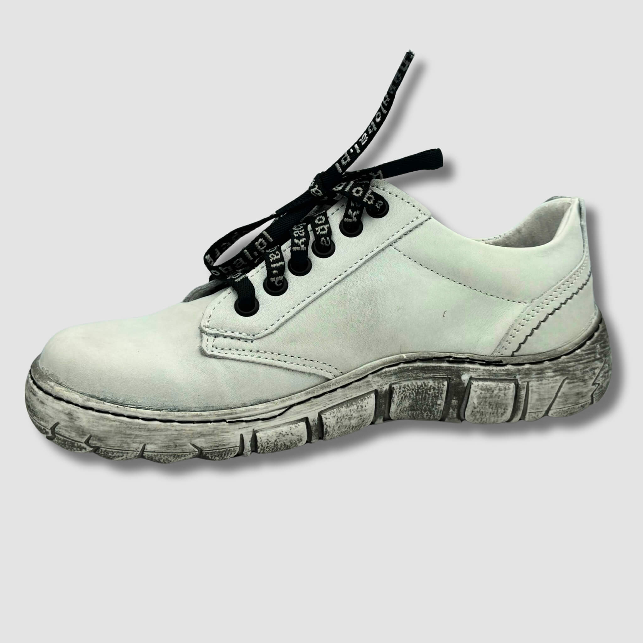 Model w klasycznej bieli z czarnymi akcentami to doskonałe połączenie komfortu i nowoczesnego designu. Charakterystyczna podeszwa w stylu vintage, o delikatnie postarzanym wyglądzie, nadaje butom unikalnego charakteru, idealnego na co dzień.