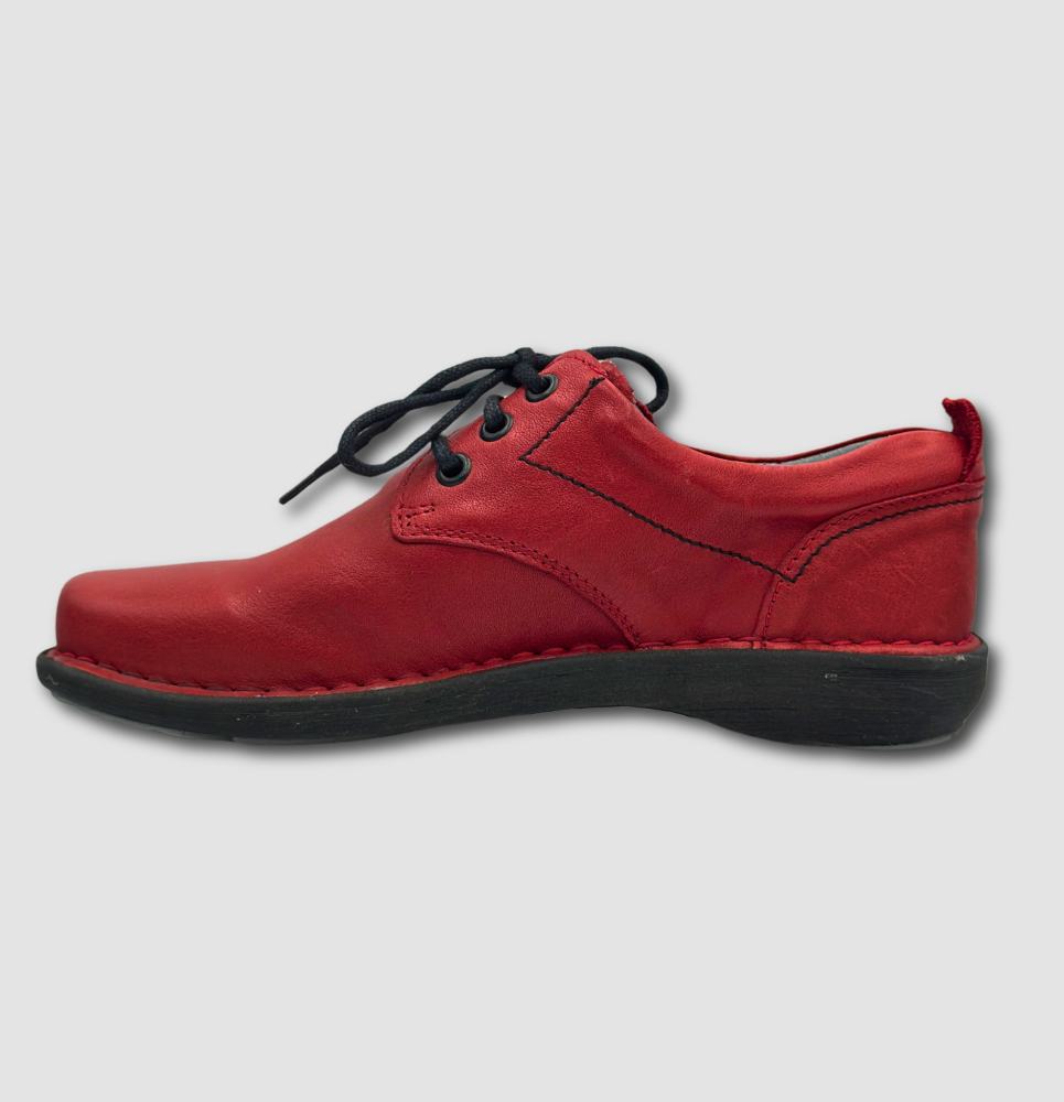 Czarne sznurówki tworzą stylowy kontrast z czerwoną cholewką, nadając całości nieco dynamicznego, sportowego akcentu. Wyprofilowana, antypoślizgowa podeszwa zapewnia komfort i pewność kroku, niezależnie od warunków.