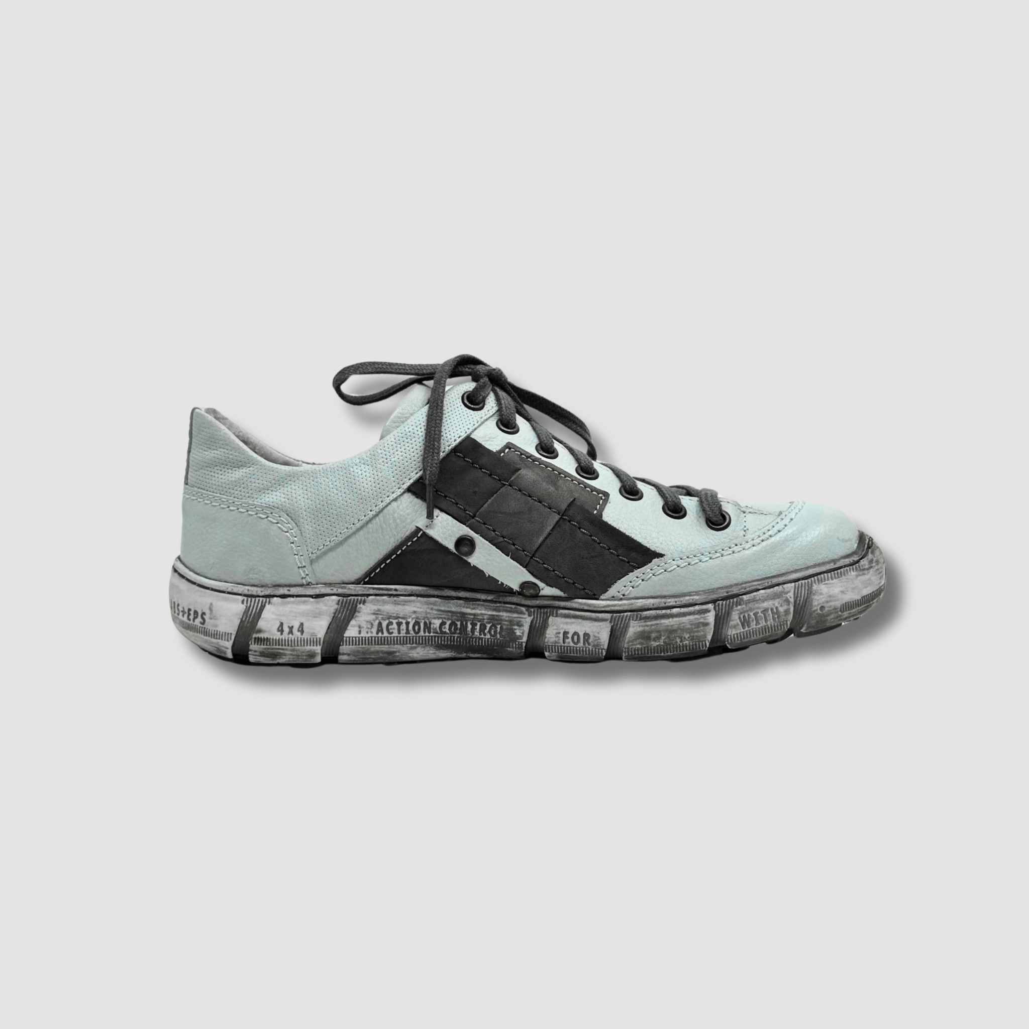 Cholewka w stonowanych odcieniach szarości, przełamana kontrastującymi czarnymi wstawkami, nadaje obuwiu nowoczesny, sportowo-miejski charakter. Ozdobne przeszycia i nitowane detale dodatkowo podkreślają unikalny styl modelu.