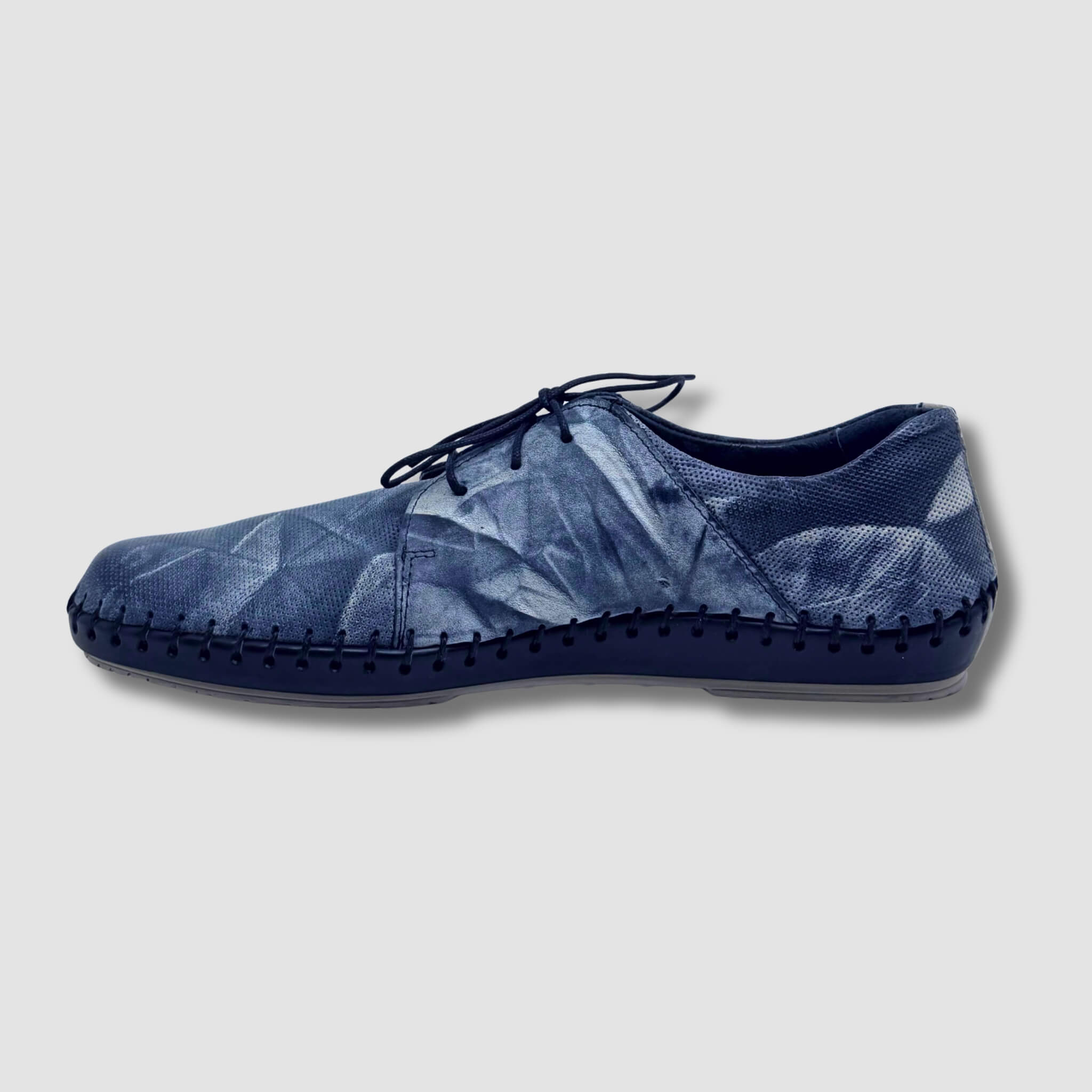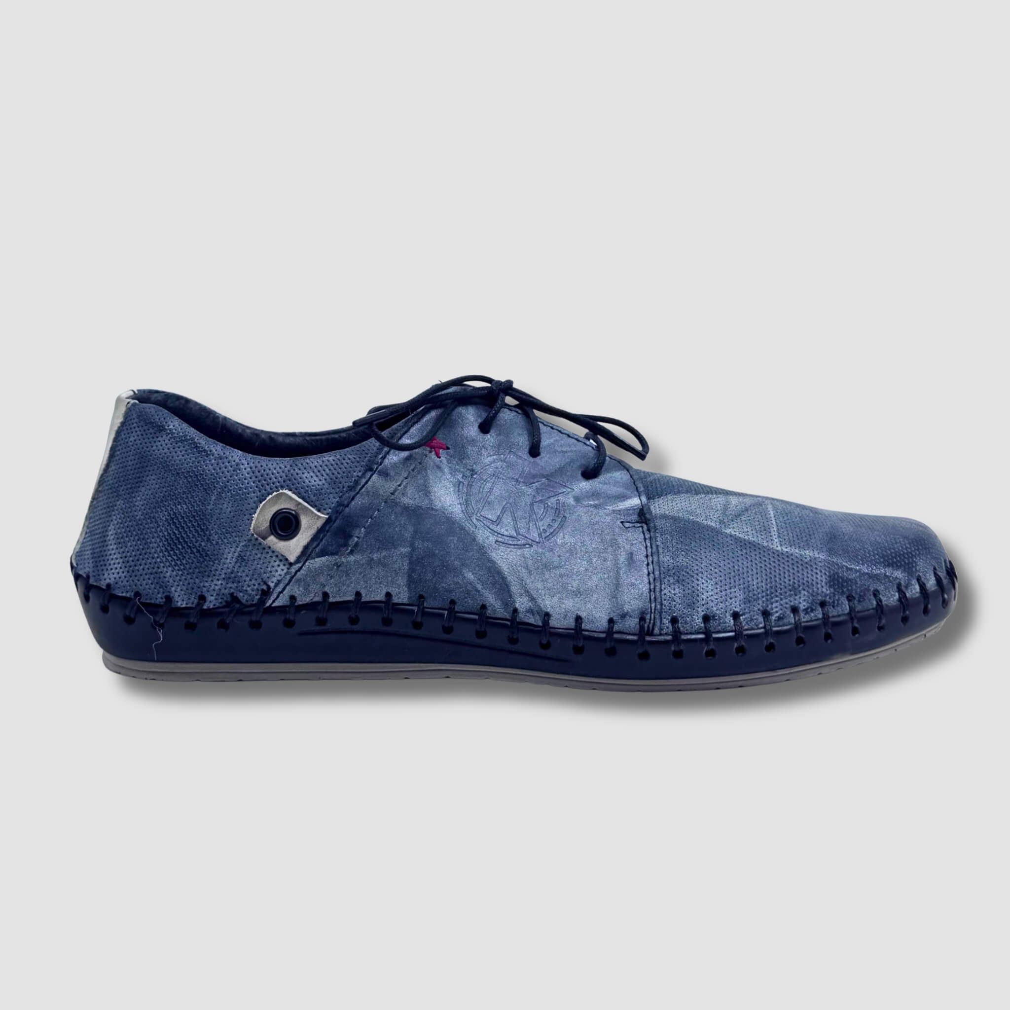 Te lekkie półbuty męskie wyróżniają się nowoczesnym designem i wysokim komfortem użytkowania. Wykonane z miękkiej skóry naturalnej typu nubuk w odcieniach niebieskiego, prezentują się stylowo i niebanalnie, idealnie wpisując się w casualowe stylizacje.
