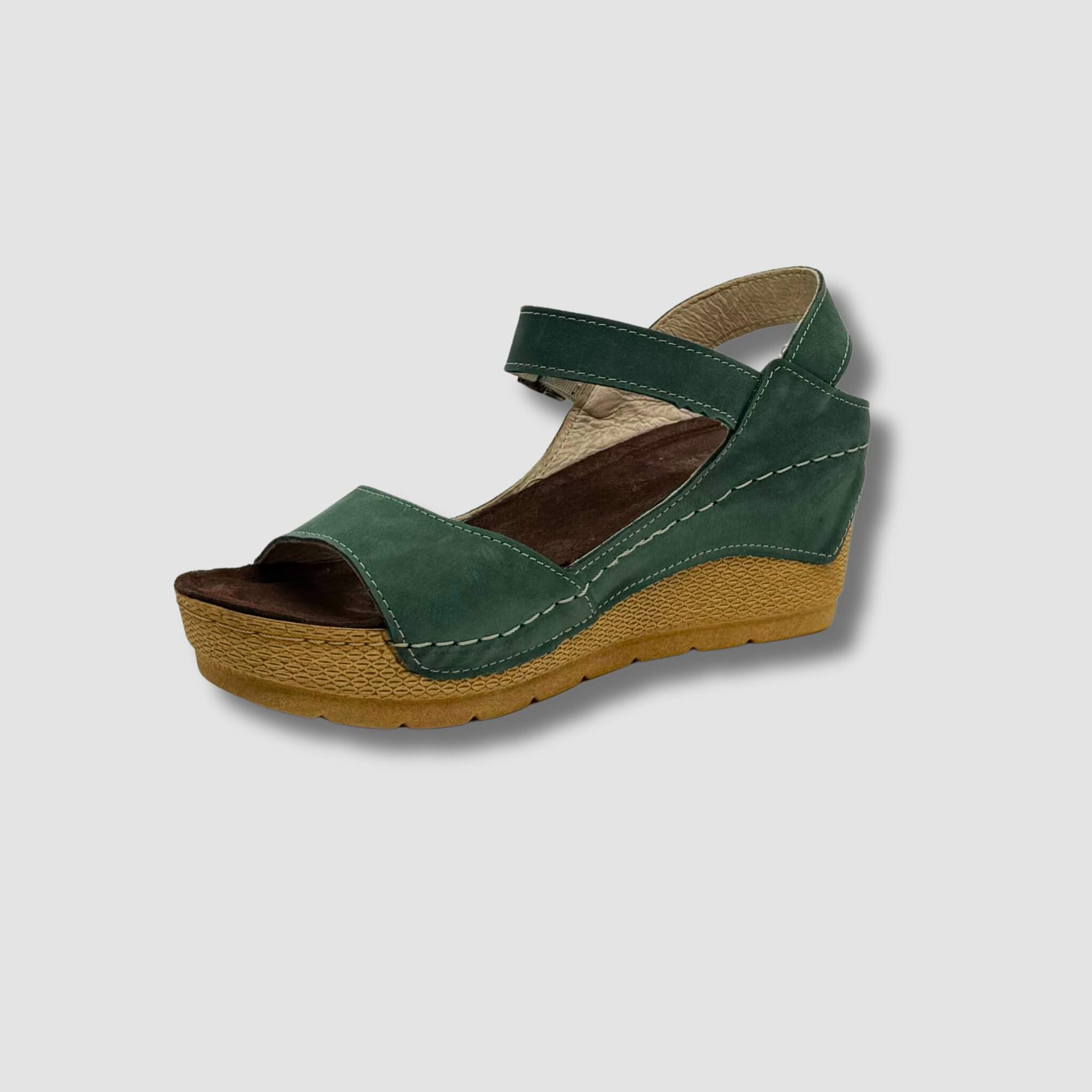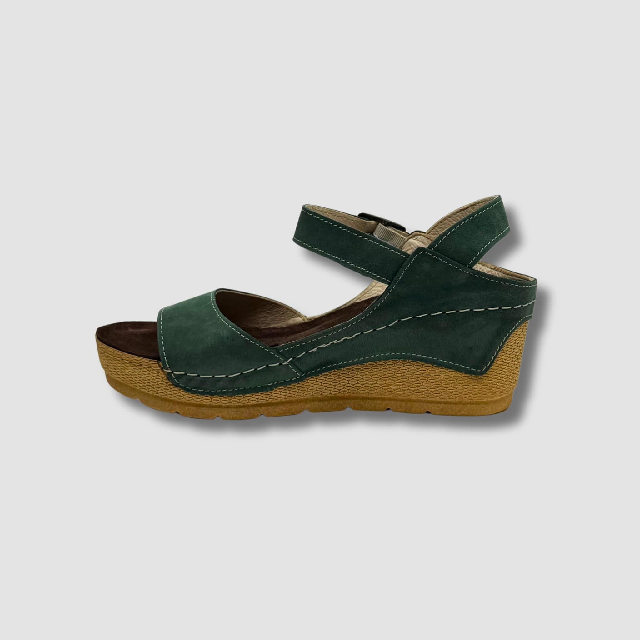 Te sandały to idealne połączenie letniej swobody i elegancji. Cholewka wykonana z wysokiej jakości nubuku w głębokim, zielonym kolorze zapewnia nie tylko estetykę, ale i trwałość. Stabilny koturn o naturalnym odcieniu z delikatnym tłoczeniem nadaje butom lekkości wizualnej i wygody użytkowania.