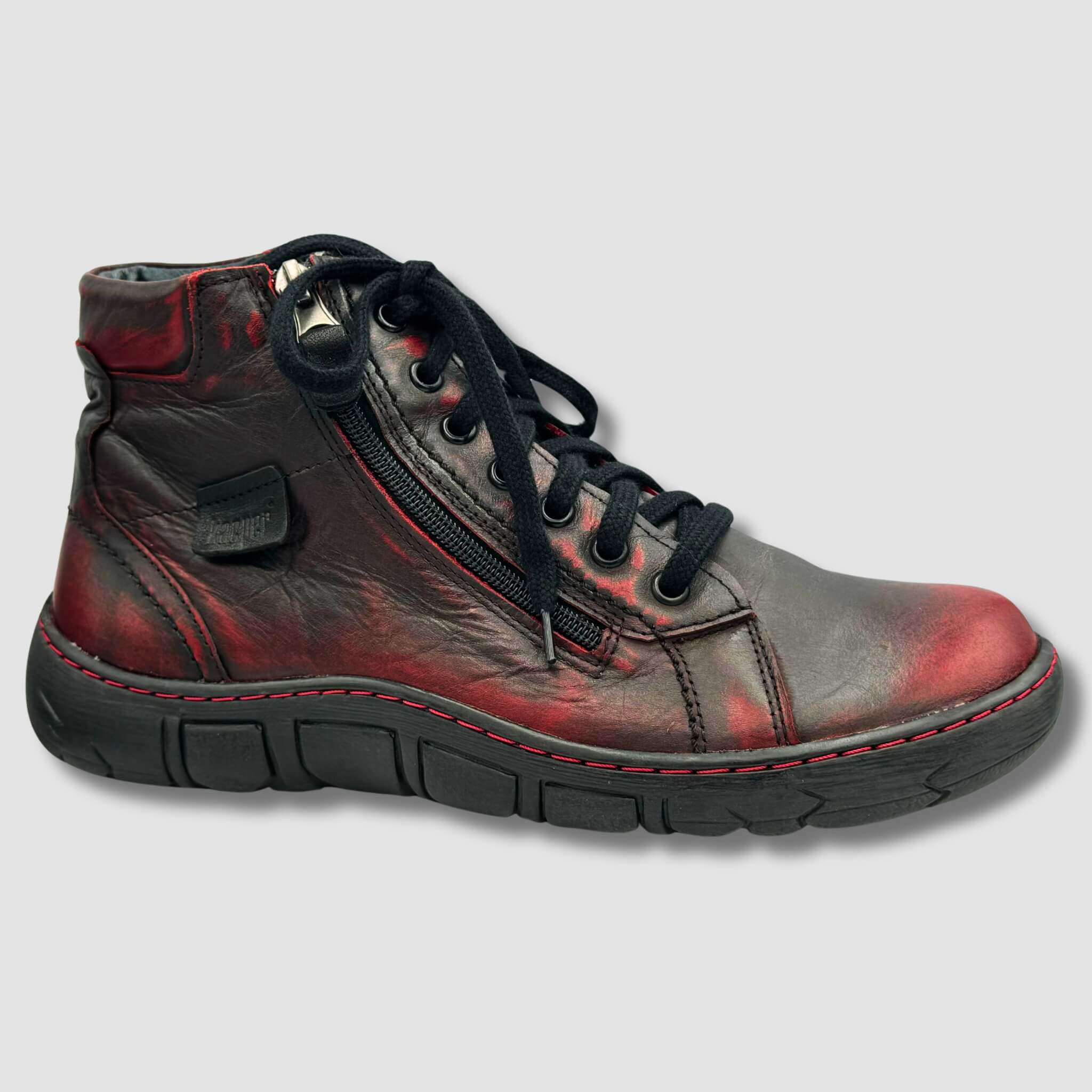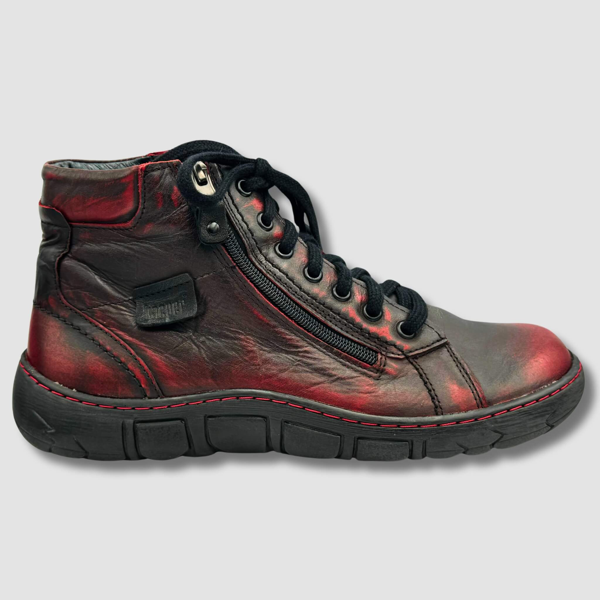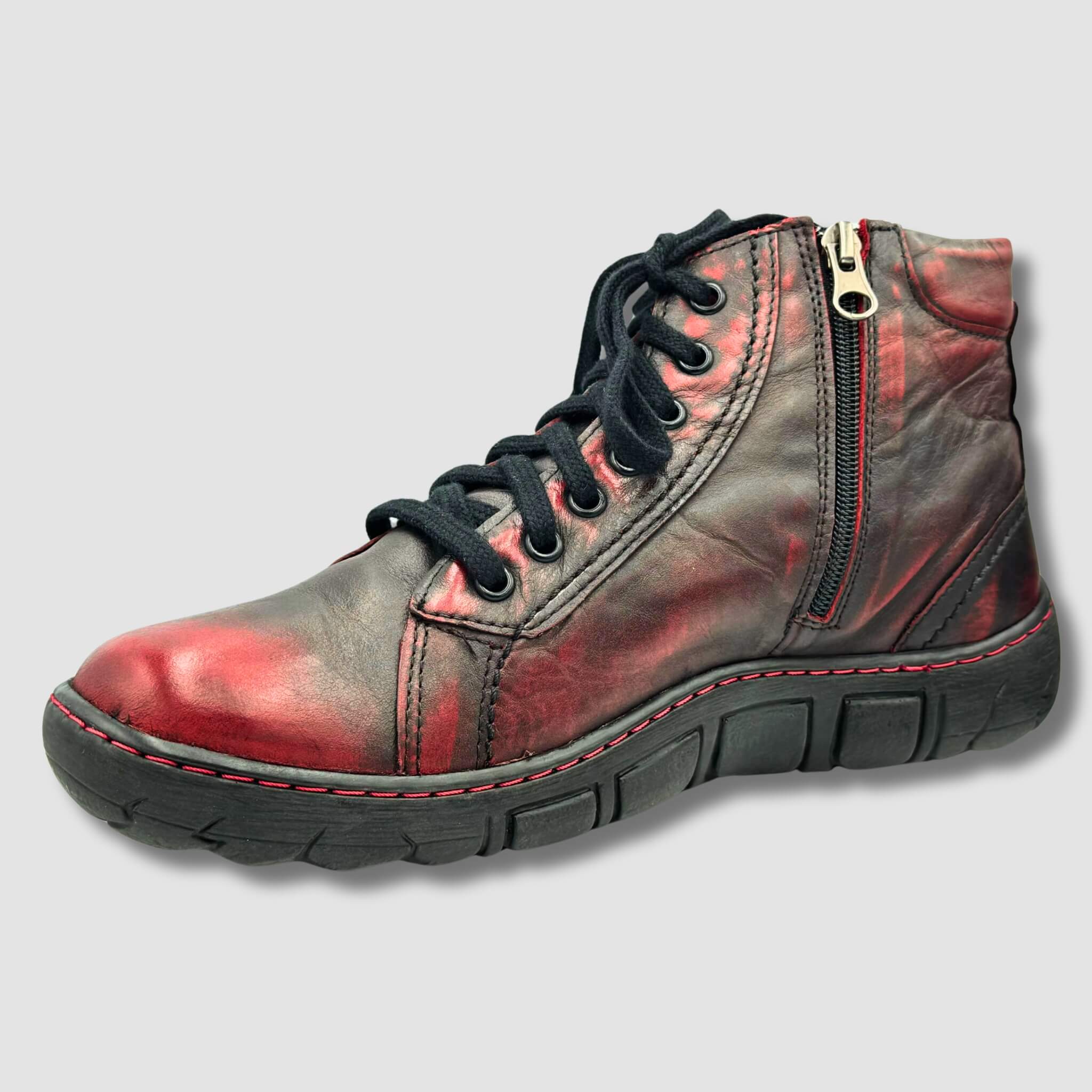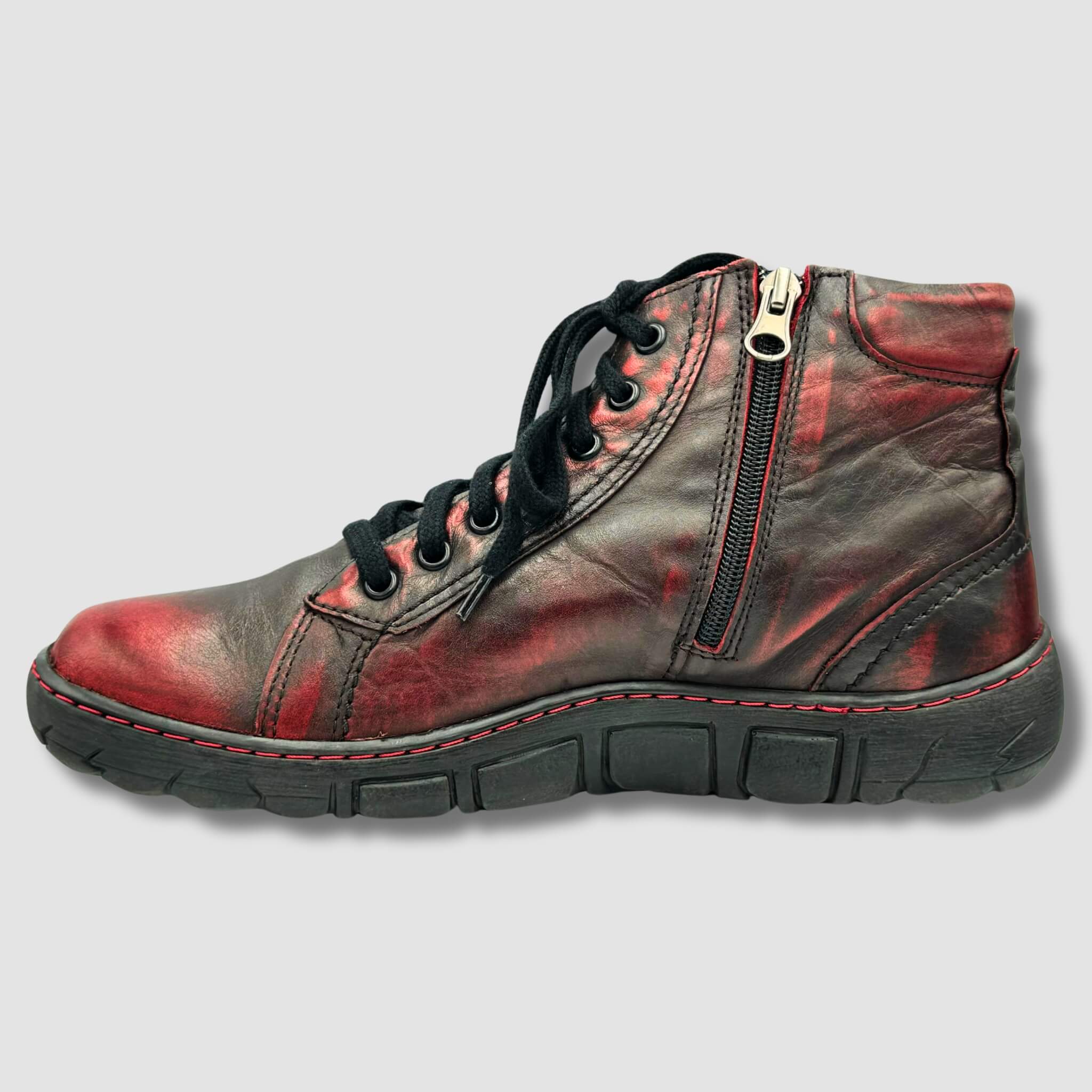 Te męskie buty od firmy KACPER w odcieniach czerwieni i czerni to idealny wybór dla osób, które cenią sobie oryginalny styl i wyjątkowy charakter. Dynamiczne połączenie barw oraz subtelne postarzenia dodają butom wyrazistości, podkreślając ich nowoczesny design. Praktyczne zapięcie na suwak, wspierane klasycznym sznurowaniem, zapewnia wygodę i idealne dopasowanie do stopy. Solidna, antypoślizgowa podeszwa dba o komfort noszenia, sprawdzając się zarówno podczas codziennego użytkowania, jak i dłuższych spacerów. Te buty to doskonałe połączenie nietuzinkowego wyglądu z funkcjonalnością, idealne dla osób, które chcą wyrazić swój indywidualizm w każdej stylizacji.