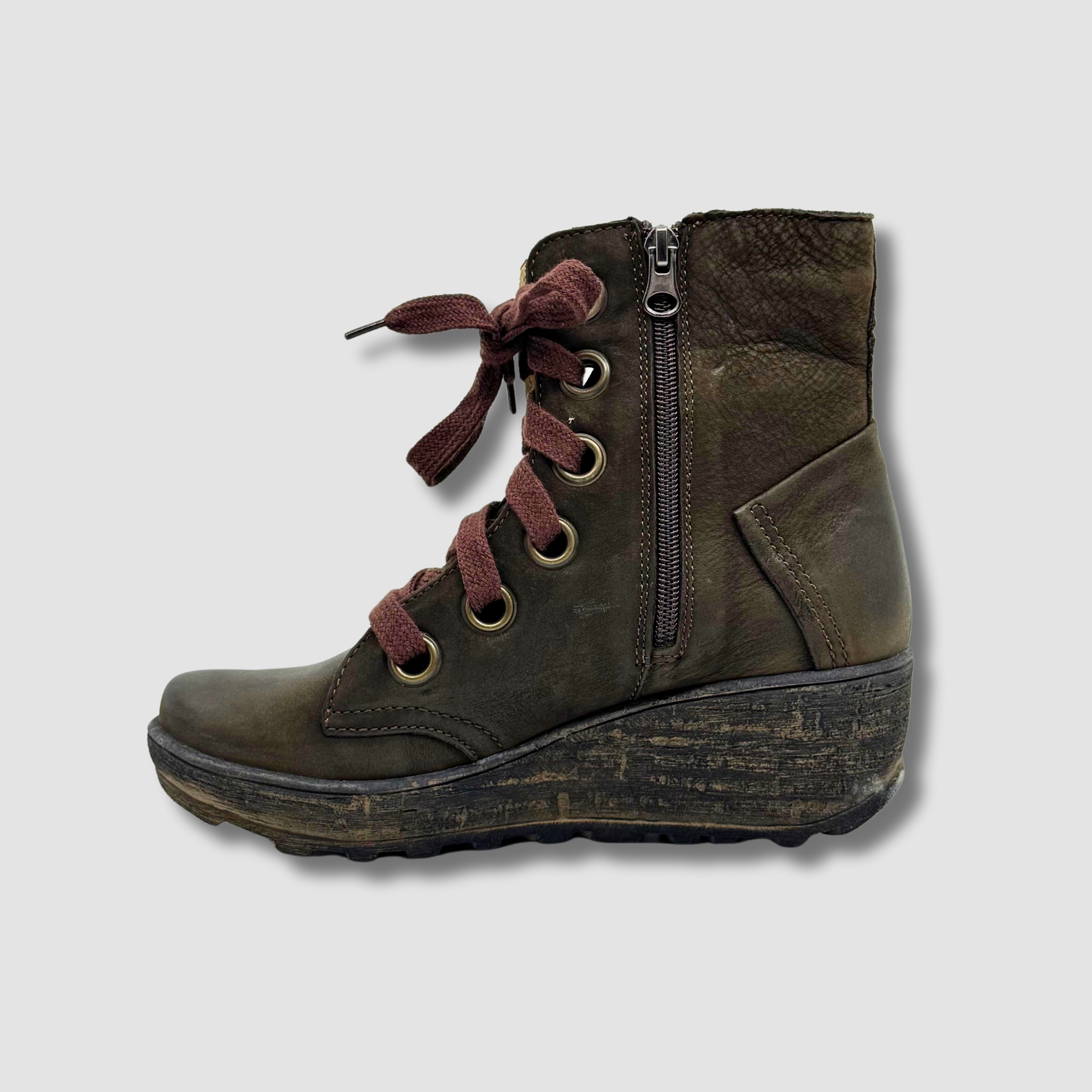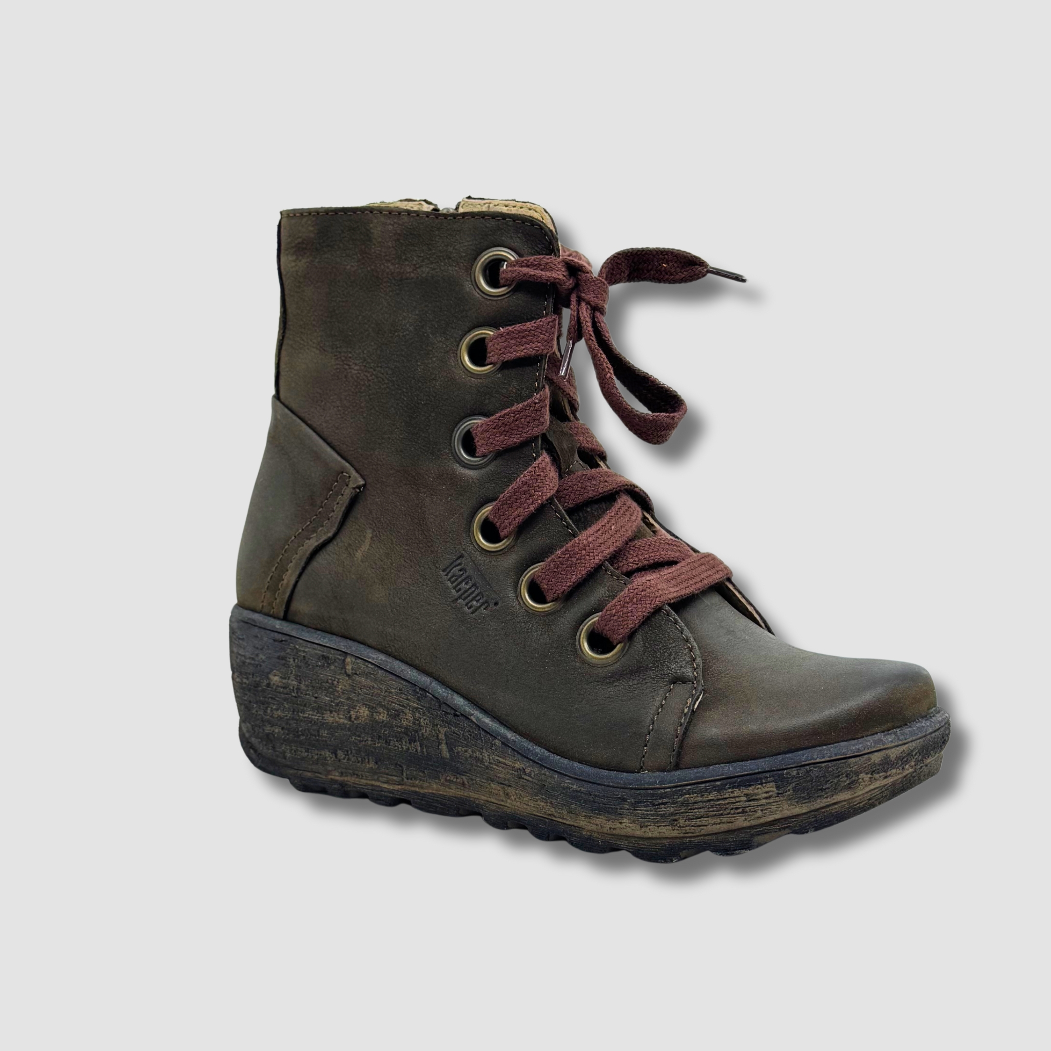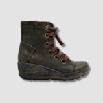 Te stylowe damskie trzewiki wyróżniają się eleganckim designem i wygodą noszenia. Wykonane z wysokiej jakości skóry naturalnej w subtelnym odcieniu oliwkowej zieleni, stanowią idealny wybór na chłodniejsze dni. Charakterystycznym elementem butów jest solidna koturnowa podeszwa o delikatnym efekcie postarzenia, która zapewnia wygodę oraz optycznie wydłuża sylwetkę. Brązowe sznurowadła oraz metalowe oczka dodają botkom nieco surowego, ale modnego charakteru, idealnie wpisując się w casualowe stylizacje. Wewnętrzna wyściółka zapewnia komfort termiczny, a solidna podeszwa z antypoślizgowym bieżnikiem gwarantuje bezpieczeństwo na różnych nawierzchniach. Dzięki bocznemu zamkowi buty są łatwe do zakładania i zdejmowania. Te trzewiki to idealny wybór dla kobiet ceniących połączenie stylu, wygody i jakości, świetnie sprawdzające się zarówno w miejskich, jak i półformalnych stylizacjach.