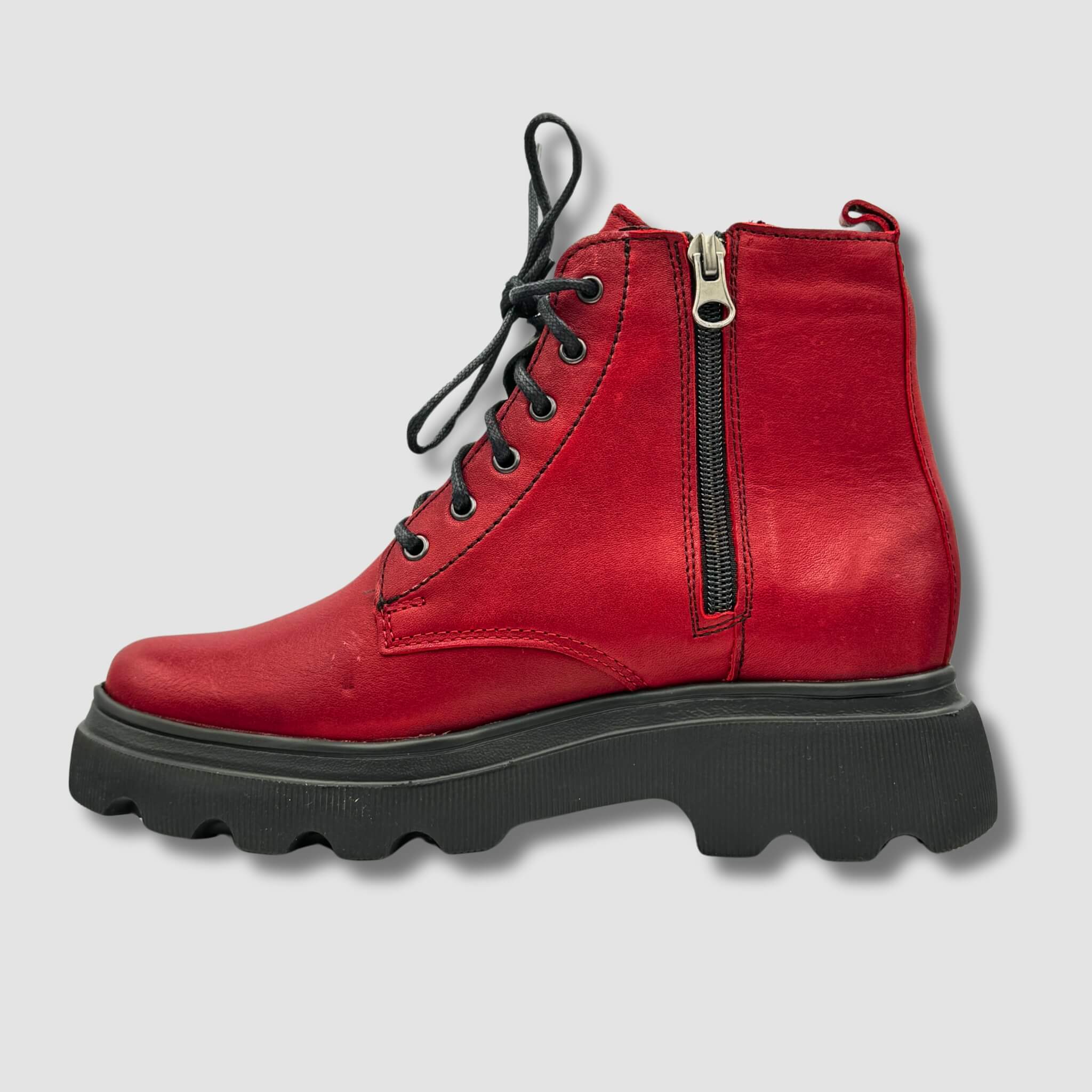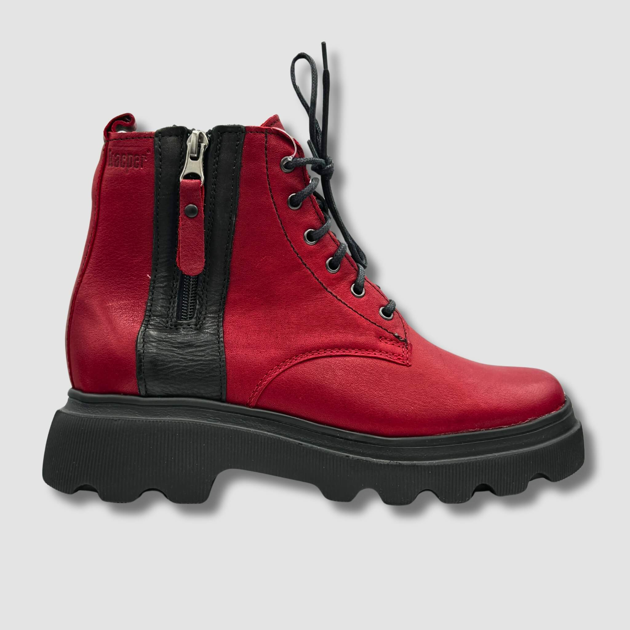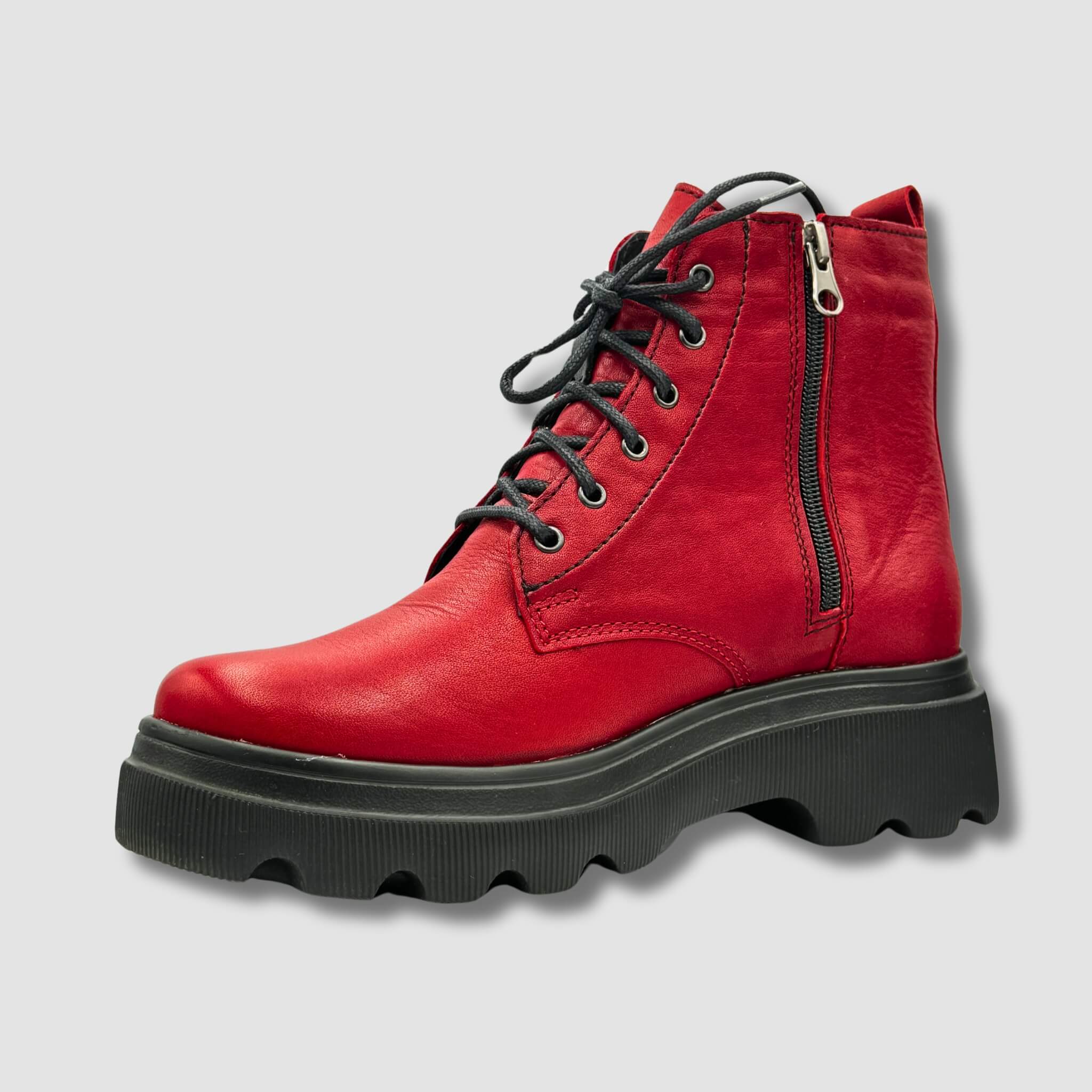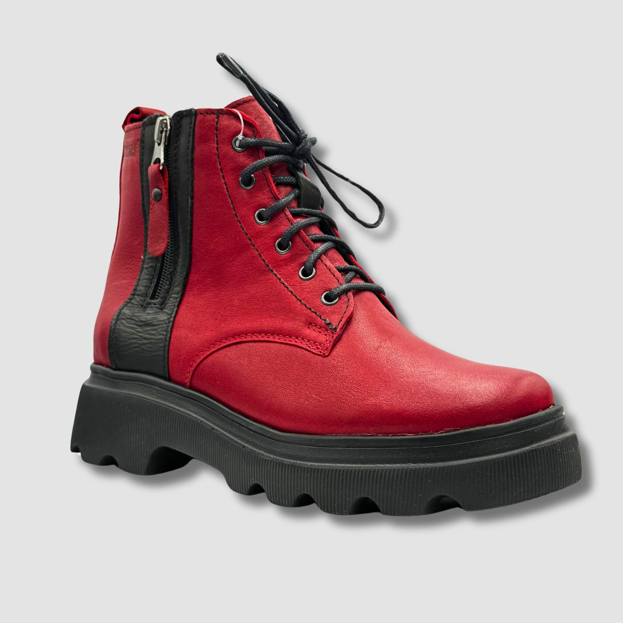 Model ten posiada zarówno klasyczne sznurowanie, jak i boczny zamek błyskawiczny, który ułatwia szybkie zakładanie i zdejmowanie butów, zapewniając jednocześnie idealne dopasowanie. Czerwono-czarna kolorystyka przyciąga wzrok, dodając odważnego charakteru każdej stylizacji.
