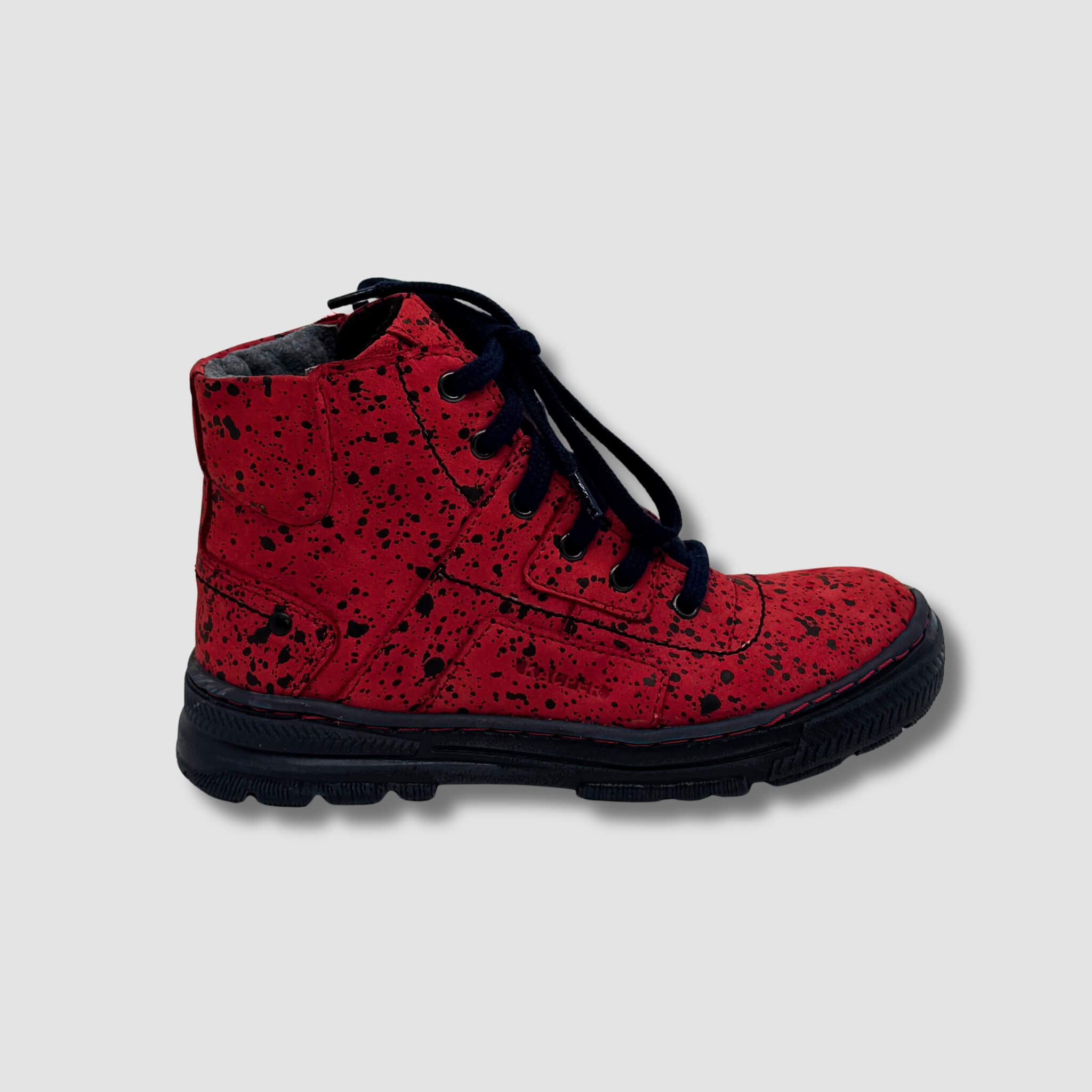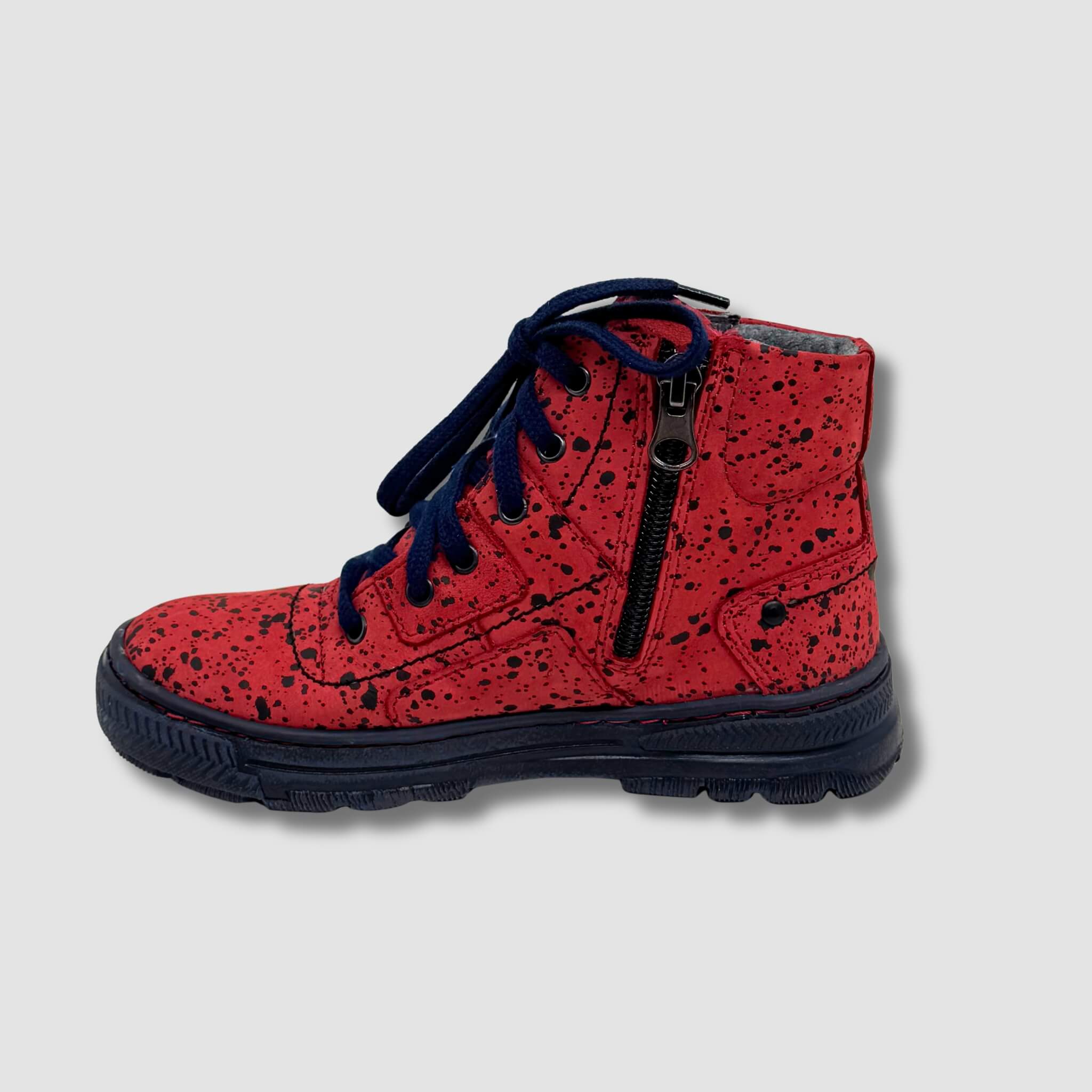 Te modne trzewiki dziecięce zostały wykonane z wysokiej jakości skóry naturalnej w intensywnym czerwonym kolorze z efektownym, czarnym nakrapianym wzorem, który nadaje im oryginalnego i nowoczesnego charakteru. To idealna propozycja dla dzieci, które lubią wyróżniać się stylowym obuwiem.